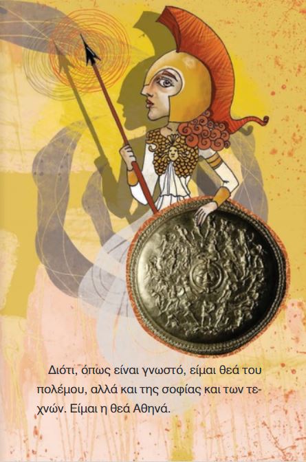 Είμαι η Αθηνά, η θεά της Αθήνας. Από τα ζώα πιο πολύ αγαπώ την κουκουβάγια. Βοηθώ τους ανθρώπους, αλλά πιο πολύ αυτούς που θέλουν οι ίδιοι να βοηθήσουν τον εαυτό τους. Στον πόλεμο είμαι πρώτη, λατρεύω όμως τις τέχνες και τα γράμματα. Μ’ αρέσει και να υφαίνω. Τα υφαντά μου είναι πιο καλά κι από τα έργα της Αράχνης…
