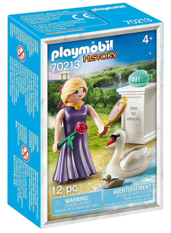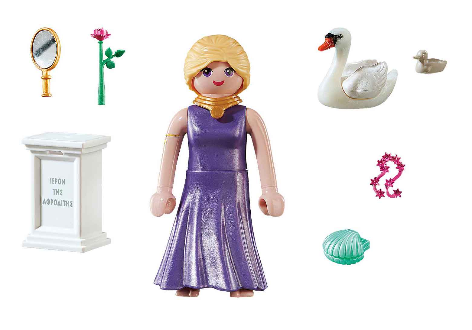 The set contains goddess Aphrodite with golden mirror, rose and swan, as well as a column with an inscription and a shell.