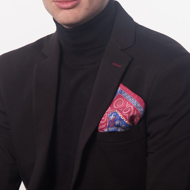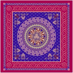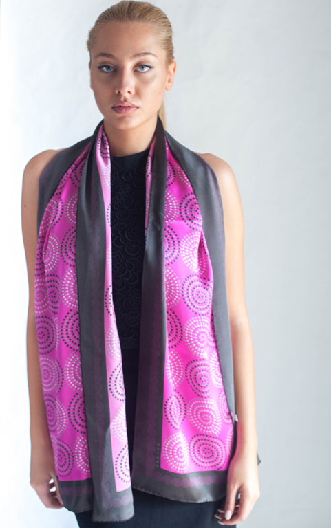 Fuchsia silk scarf decorated with spiral motifs.