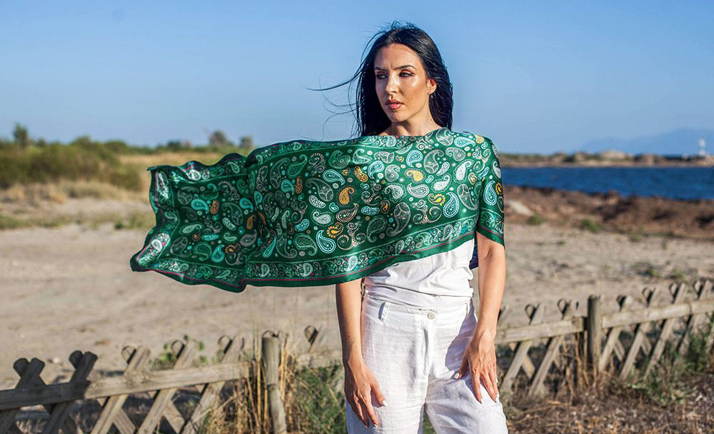 Μεταξωτό φουλάρι διακοσμημένο με αρχαιοελληνικά σχέδια σε πράσινο χρώμα.